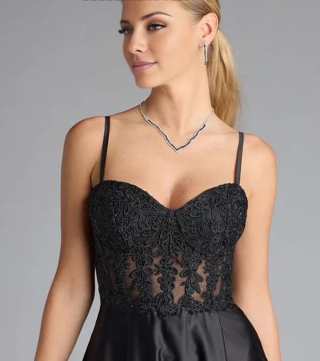 Elegant A-Line Sweetheart Neck Spaghetti Strap Lace-Detailed Slit Satin Floor-Length Evening Dress - US 2 / UK 6 / EU 32