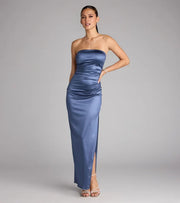 Fashion Sheath Off the Shoulder Neck Sleeveless Strapless Ruched Slit Satin Floor-Length Evening Dress - US 2 / UK 6 / EU 32