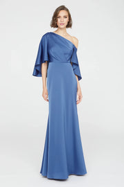 Fashion Slate Blue One-Shoulder Neck Cape-Sleeve Satin Mermaid Floor-Length Evening Dress - US 2 / UK 6 / EU 32