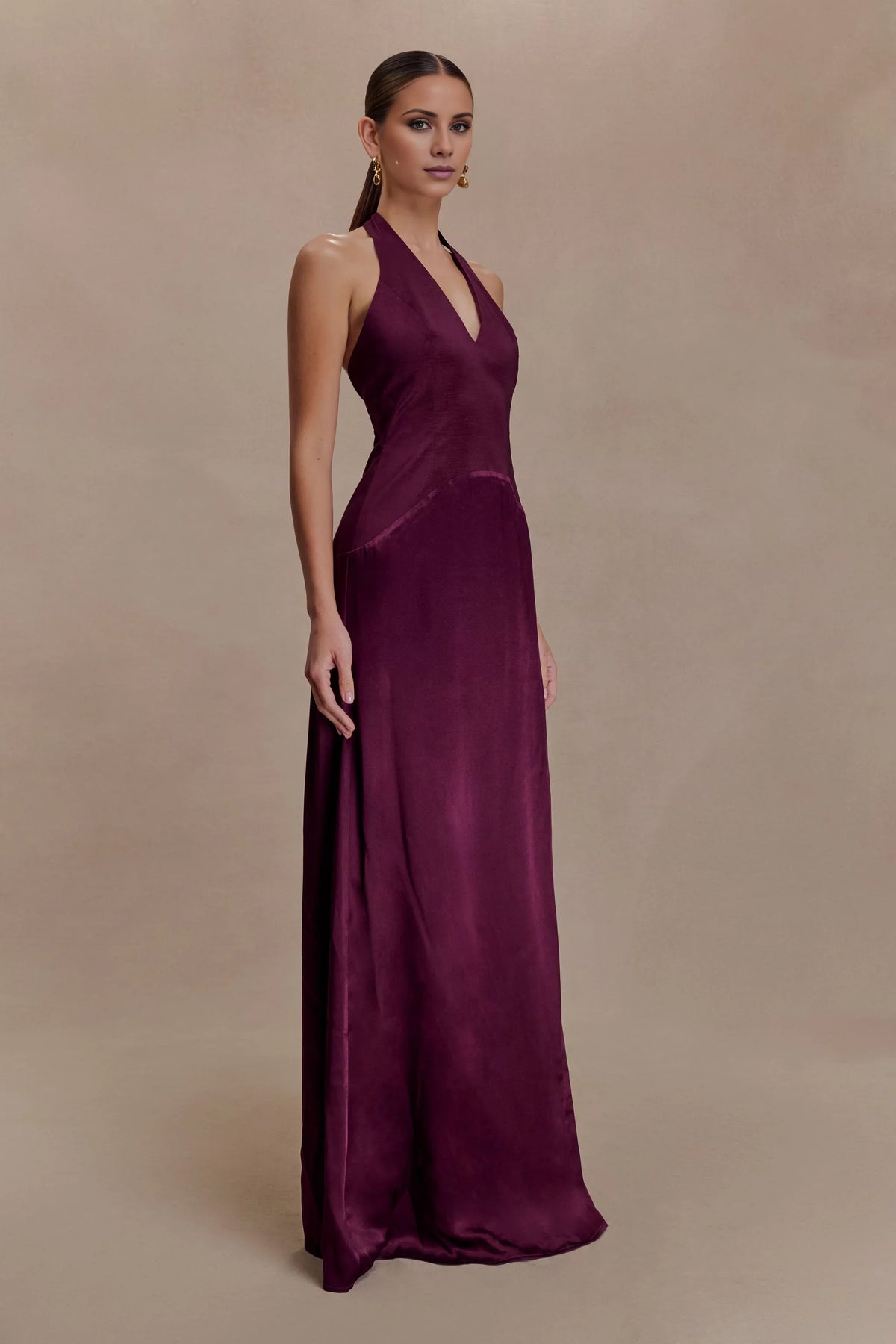 Whimsical Satin Halter-Neck Sleeveless Open-Back Flowy Floor-Length Evening Dress - US 2 / UK 6 / EU 32
