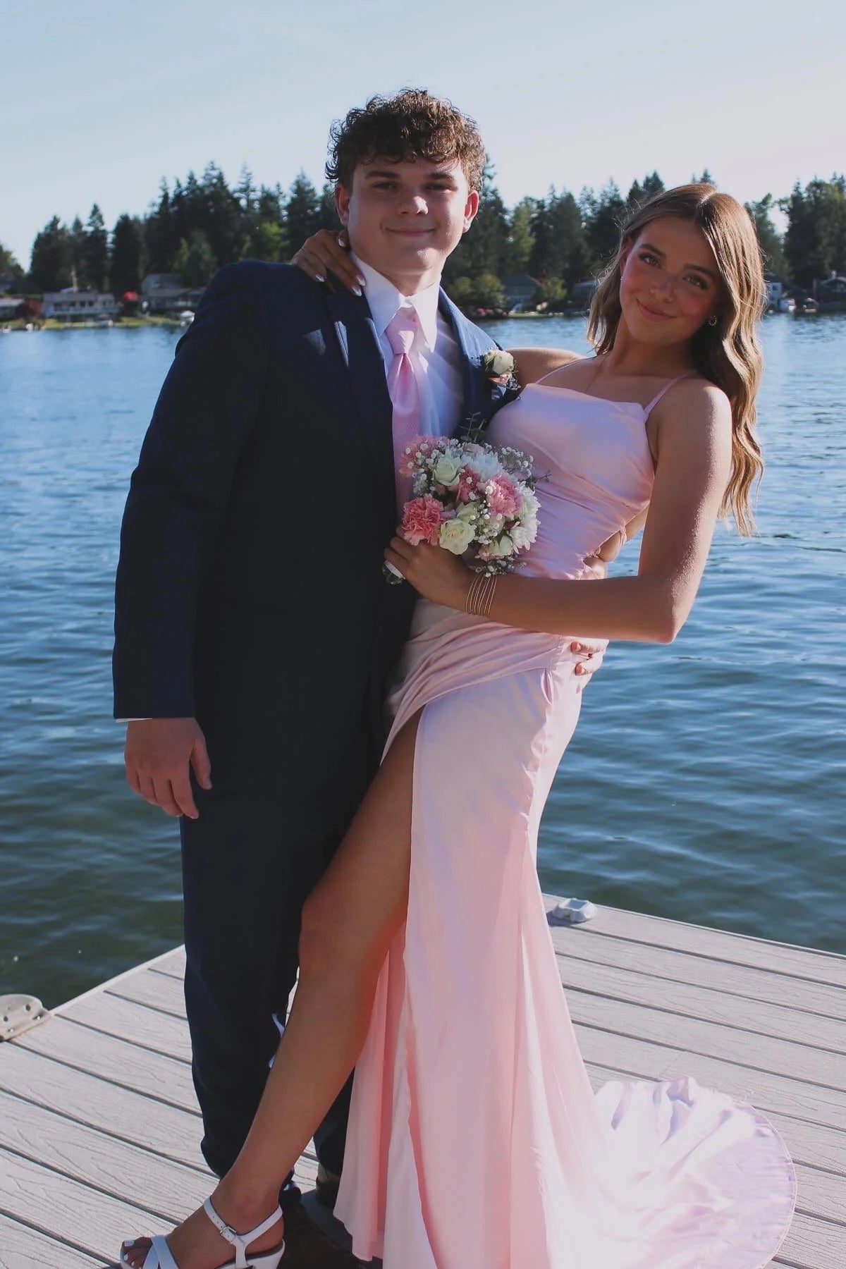 This elegant prom dress does not include any accessories shown in the image, such as a cape, jacket, gloves, veil, or handbag.