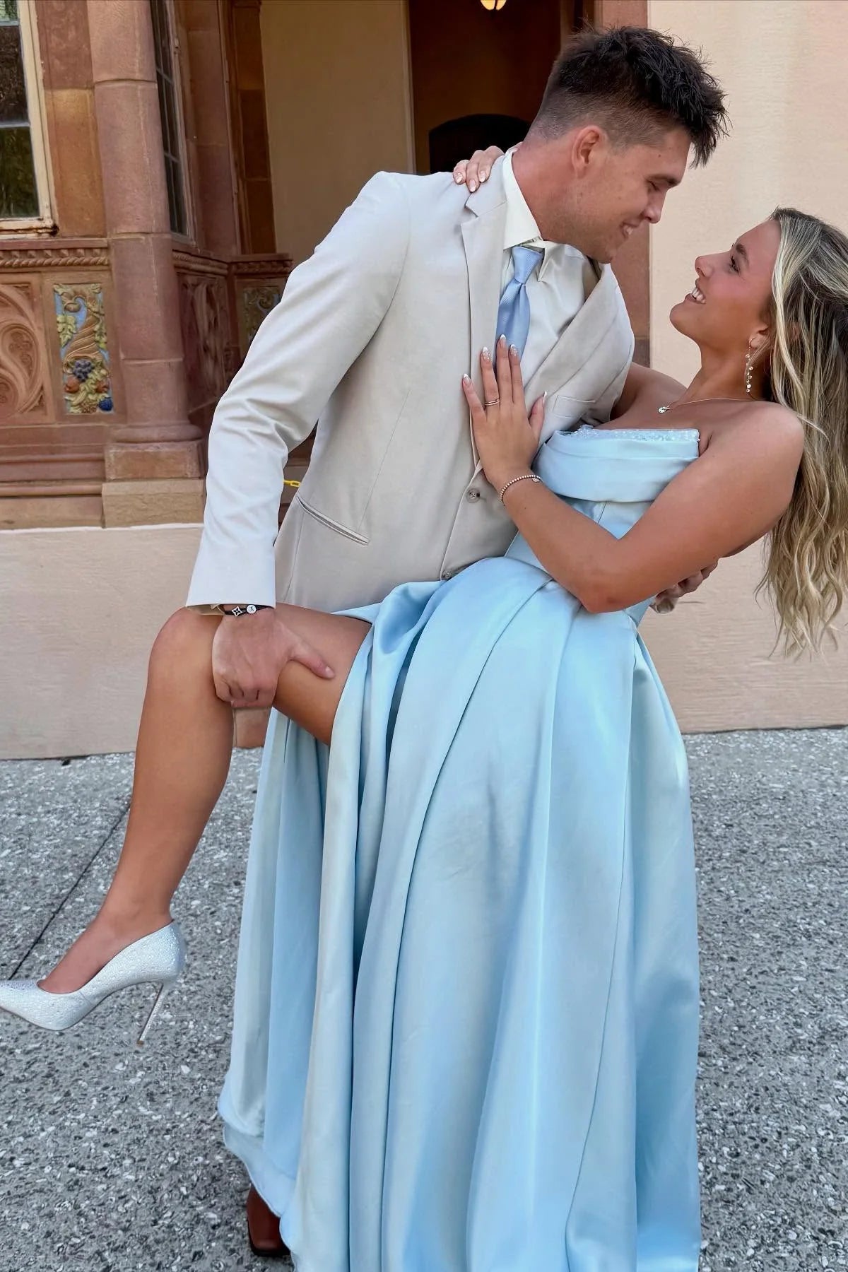 This luxe satin prom dress features a glamorous strapless sweetheart neckline with delicate beaded detailing, a dramatic lace-up back, and a high side slit that balances grace and mobility. The flowy A-line silhouette and lustrous fabric create a regal, red-carpet-ready look—ideal for prom, weddings, or upscale evening events.