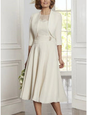 Vestido elegante de dos piezas para madre de la novia, corte A, para fiesta, escote redondo, largo hasta la rodilla, encaje de gasa, manga 3/4 con pliegues y cristales.
