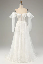 Vestido de novia de princesa blanco con corte A, encaje transparente y corsé ajustado