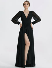 Vestido de noche elegante de corte A, vestido formal hasta el suelo, manga larga, cuello en V, gasa con abertura