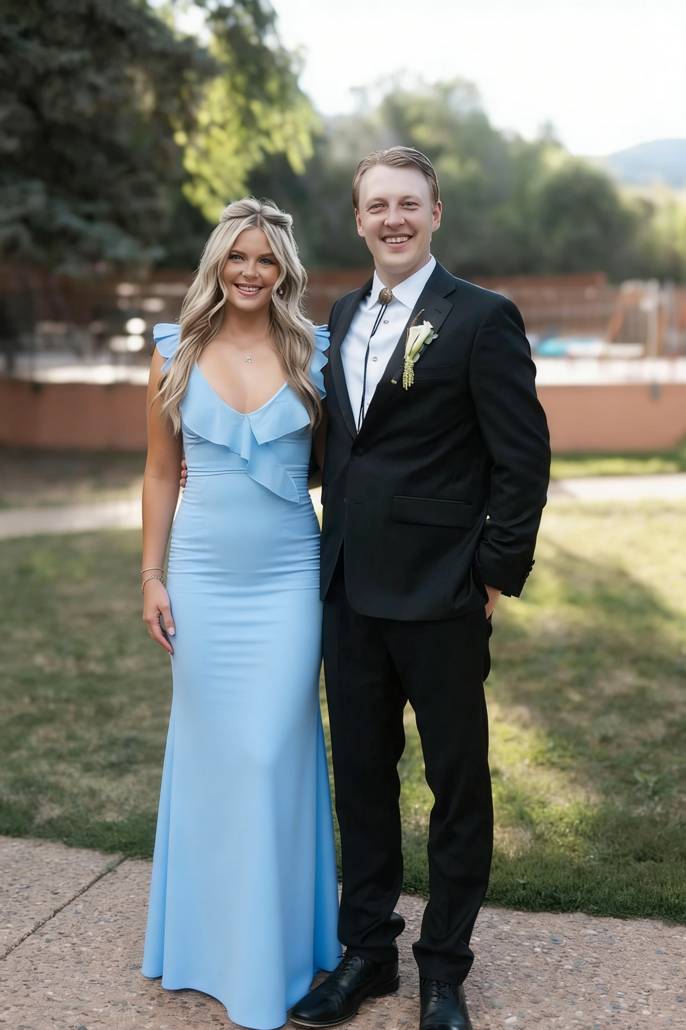 Make a stunning entrance at prom in this sky blue chiffon gown, crafted from lightweight, flowy fabric. It features a flattering V-neckline adorned with delicate ruffle trim, feminine ruffle cap sleeves, and a figure-hugging mermaid silhouette that cascades into a floor-length hem with romantic ruffled detailing. Perfect for prom night, this gown balances softness with structure to create a memorable, photo-ready look.