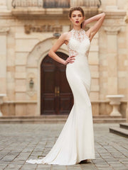 Vestidos de licra con cuello alto, sin mangas, corte trompeta/sirena, con cola larga y apliques