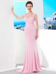 Vestidos de licra con escote trompeta/sirena, joya, mangas cortas, cola larga y abalorios - EE. UU. 2 / Reino Unido 6 / UE 32