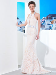 Vestidos de satén con encaje, sin mangas, con escote halter y cola larga - EE. UU. 2 / Reino Unido 6 / UE 32