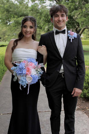This chic prom dress is crafted from luxe, stretchy fabric, featuring a romantic strapless sweetheart neckline, a figure-flattering ruched bodice, and a sleek mermaid silhouette that flares gently at the floor. The eye-catching two-tone design, oversized back bow with a flowing train, and minimalist open back create a sophisticated, red-carpet-ready look, making it ideal for prom, weddings, or any occasion where you want to exude modern elegance and confidence.