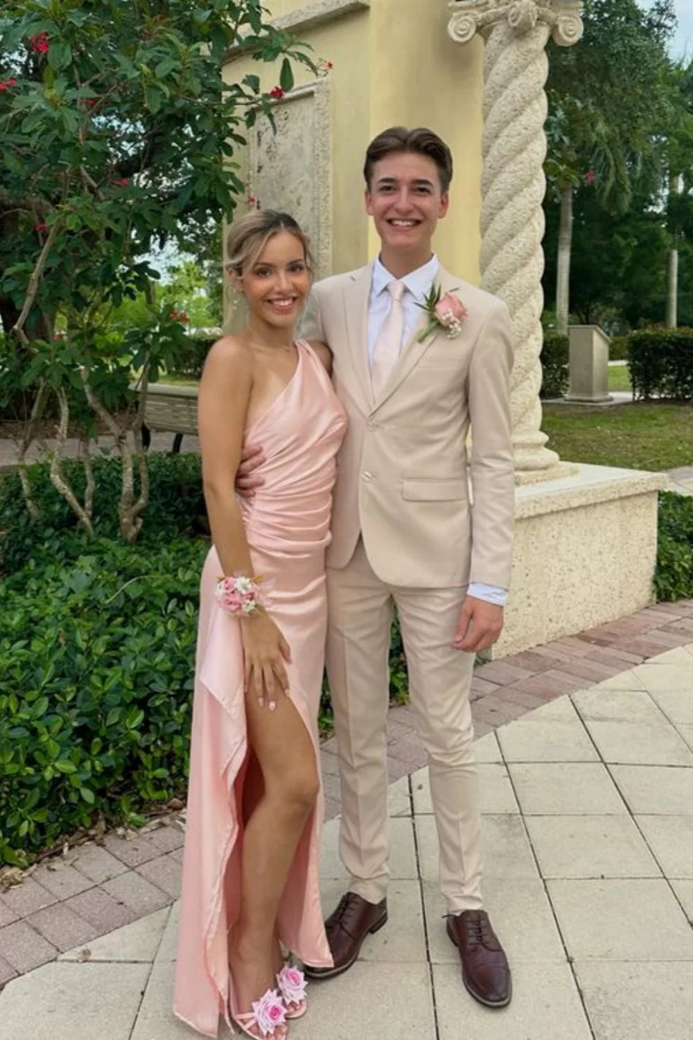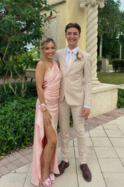 Satin One-Shoulder Asymmetric Ruched High-Slit Asymmetric Hem Mermaid Prom Dress - Blush Pink / US 2 / UK 6 / EU 32