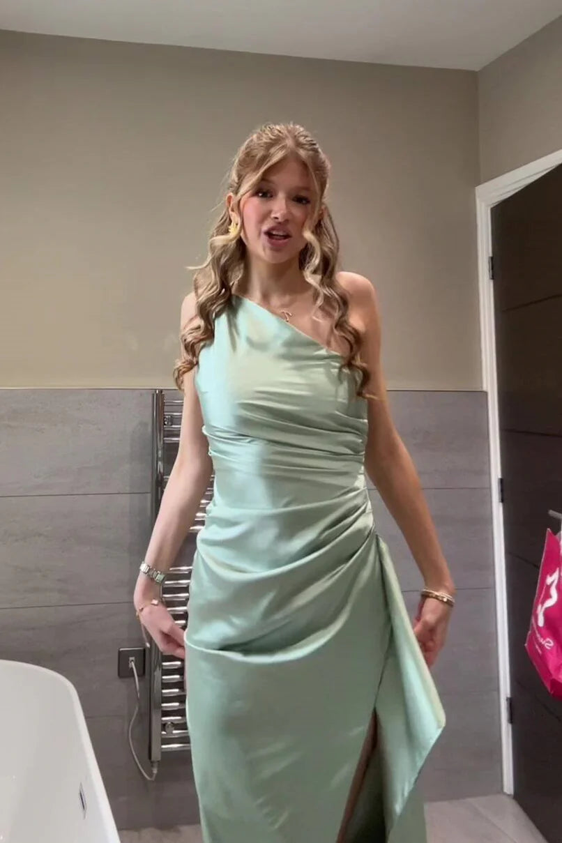 Satin One-Shoulder Asymmetric Ruched High-Slit Asymmetric Hem Mermaid Prom Dress
