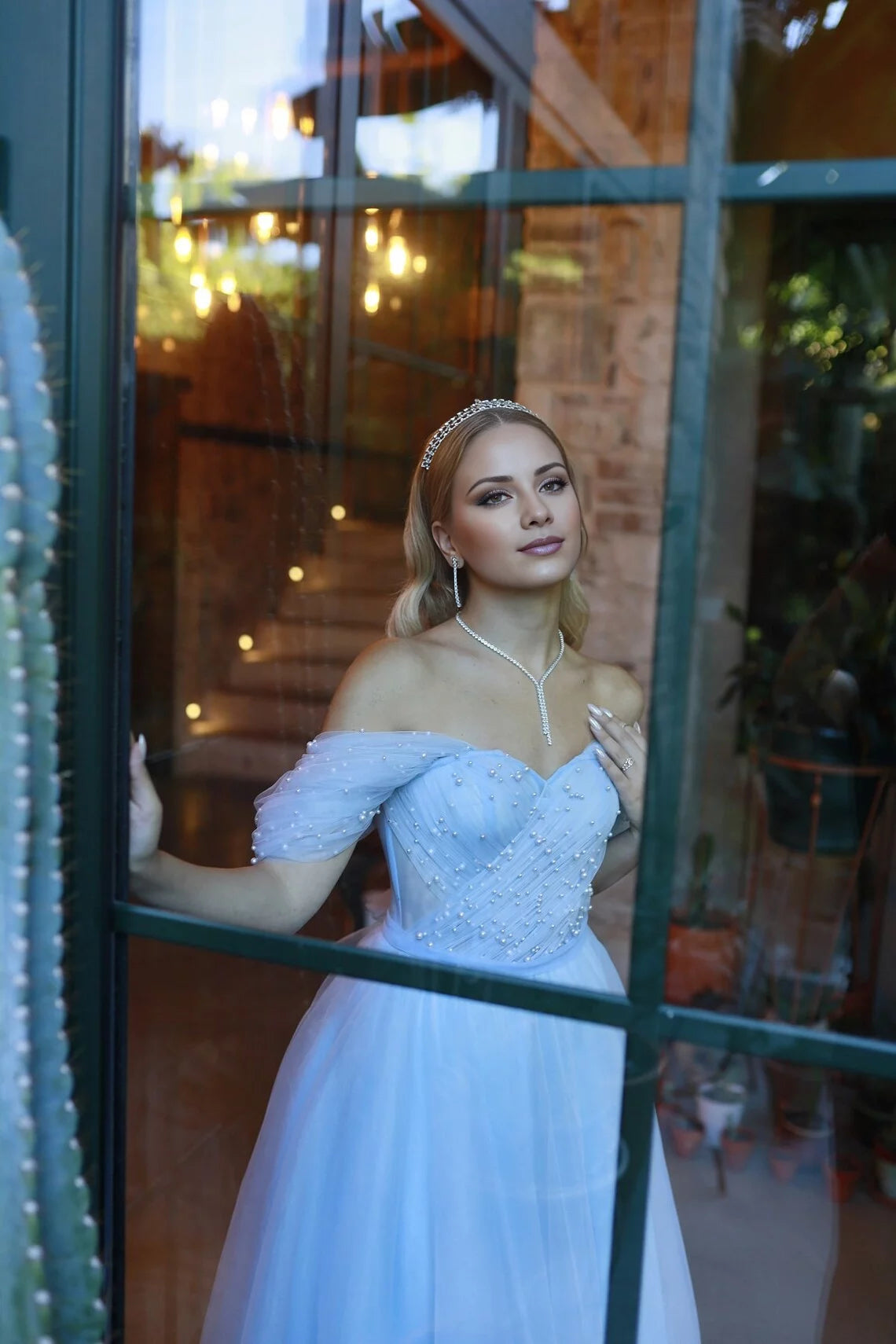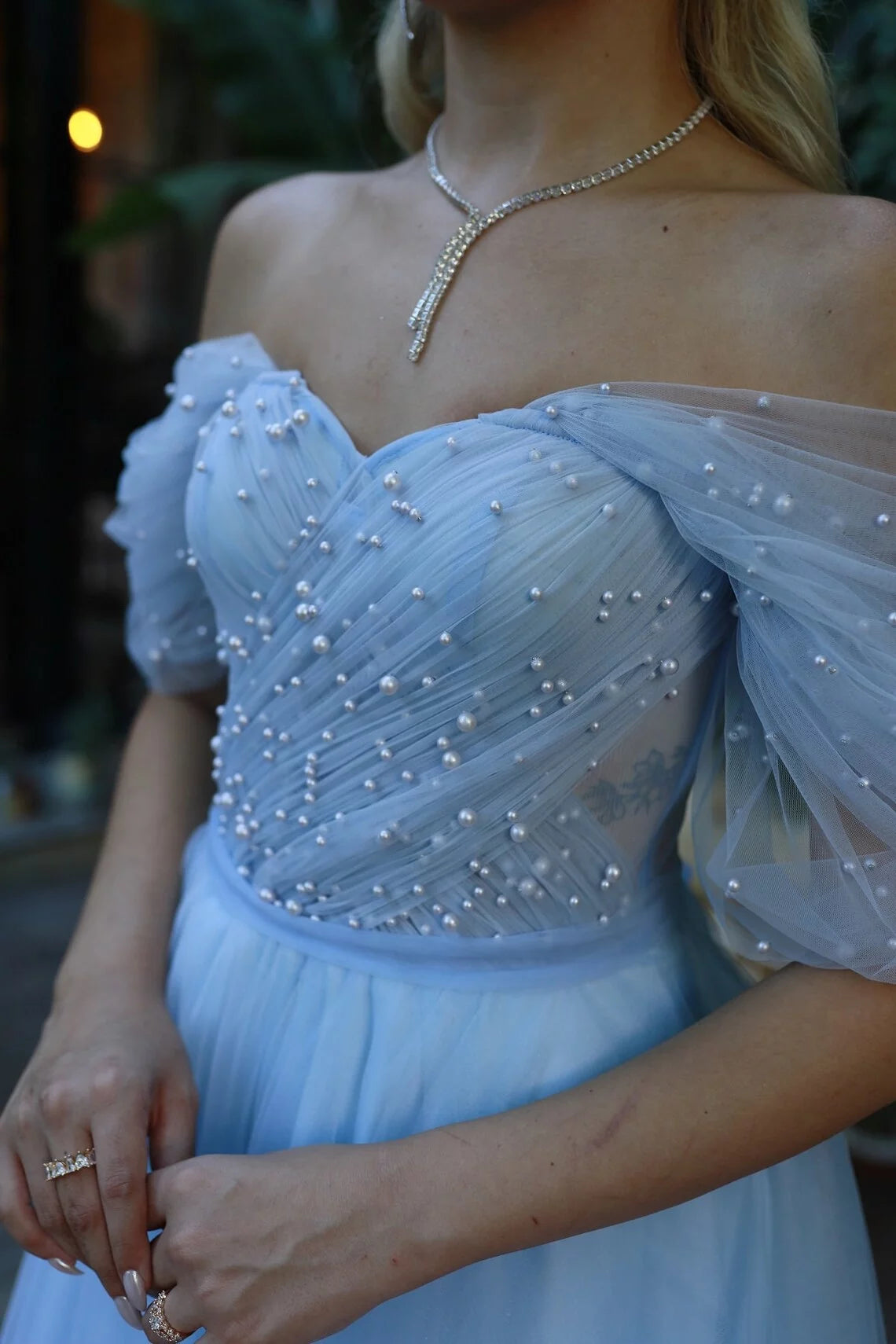 This fairy-tale prom dress blends whimsical volume with delicate detail: crafted from lightweight tulle (in a soft sky blue hue), it features an off-the-shoulder neckline, sheer pearl-embellished sleeves, a lace-up back for adjustable fit, and a full tea-length ballgown skirt that billows gracefully. Ideal for prom nights, outdoor garden galas, or enchanted teen celebrations, its style balances regal charm with dreamy softness— the tulle catches natural light for an ethereal glow, while the pearls add subtle, luminous texture. Pair with dainty tiara or floral accessories to enhance the dress’s fairy-tale vibe; available in pastel color variations.