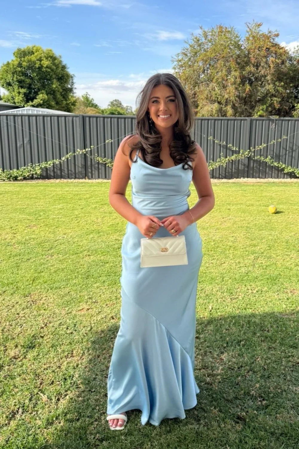 This elegant satin prom dress features a soft draped cowl neckline that delivers a romantic and sophisticated look, crafted from smooth, lustrous satin fabric for a luxurious touch. It comes with delicate spaghetti straps leading to a stunning crisscross open back with an adjustable self-tie closure for a customized, secure fit. The dress showcases a flowy A-line maxi silhouette with an asymmetric hem design for graceful movement, making it the perfect choice for prom night, homecoming, formal dances, weddings and all special formal occasions.