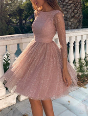 Vestidos de cóctel de corte A, bonitos vestidos para fiesta de graduación, largo hasta la rodilla, mangas 3/4, cuello joya, para invitados de boda de otoño, tul con pliegues y lentejuelas