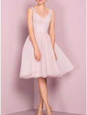 Vestido de cóctel de corte A, vestido coqueto para regreso a casa, graduación, largo hasta la rodilla, sin mangas, cuello en V, vestido rosa de tul con pliegues