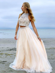 Vestido de dos piezas corte A/princesa, cuello alto, tul, cuentas, sin mangas, largo hasta el suelo - EE. UU. 2 / Reino Unido 6 / UE 32