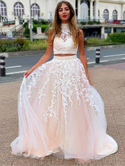 Vestido de dos piezas de corte A/princesa, sin mangas, cuello alto, apliques de tul y cola larga