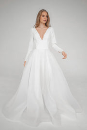 Step into timeless elegance with this A-line wedding dress. It features a deep V - neckline that adds allure, long sleeves for a sophisticated touch, and an open back design that brings a hint of glamour. The maxi length, with its flowing silhouette and graceful train, creates a truly regal appearance, perfect for making a memorable entrance on your wedding day. Crafted from luxurious fabric, this dress ensures you look and feel like royalty as you walk down the aisle.