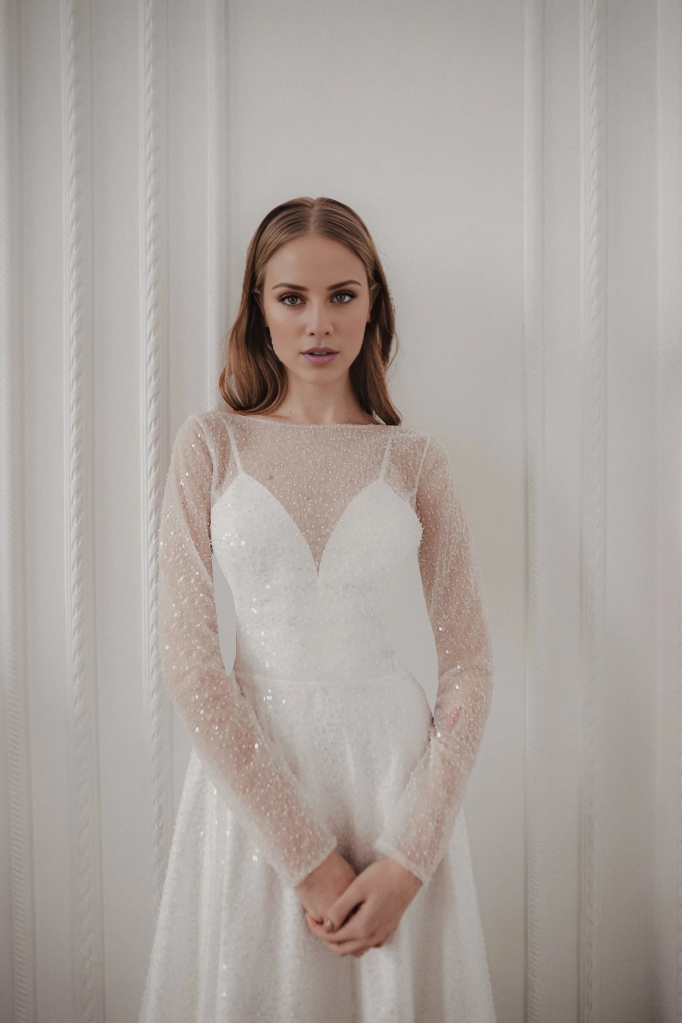 Elegant A-Line Illusion Neckline Sparkle Long Sleeve Open Back Maxi Winter Wedding Dress - US 2 / UK 6 / EU 32
