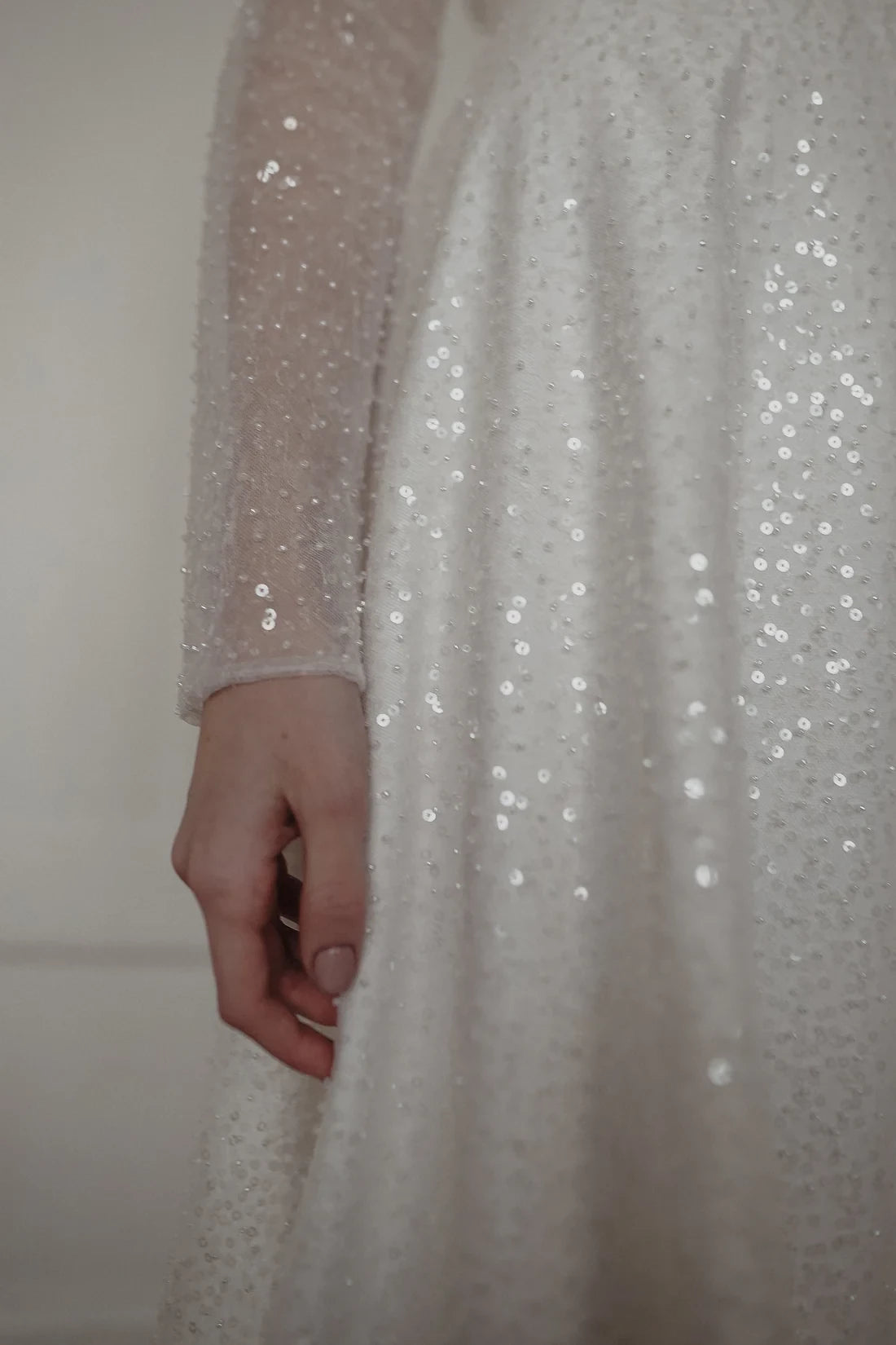 Step into timeless elegance with this A - line wedding dress. It features an illusion neckline that adds a touch of mystery and allure, sparkle - detailed long sleeves for a glamorous look, and an open back design that brings a hint of sophistication. The maxi length, with its flowing silhouette and graceful train, creates a truly regal appearance, perfect for making a memorable entrance on your wedding day. Crafted from luxurious, shimmering fabric, this dress ensures you look and feel like royalty as you walk down the aisle.