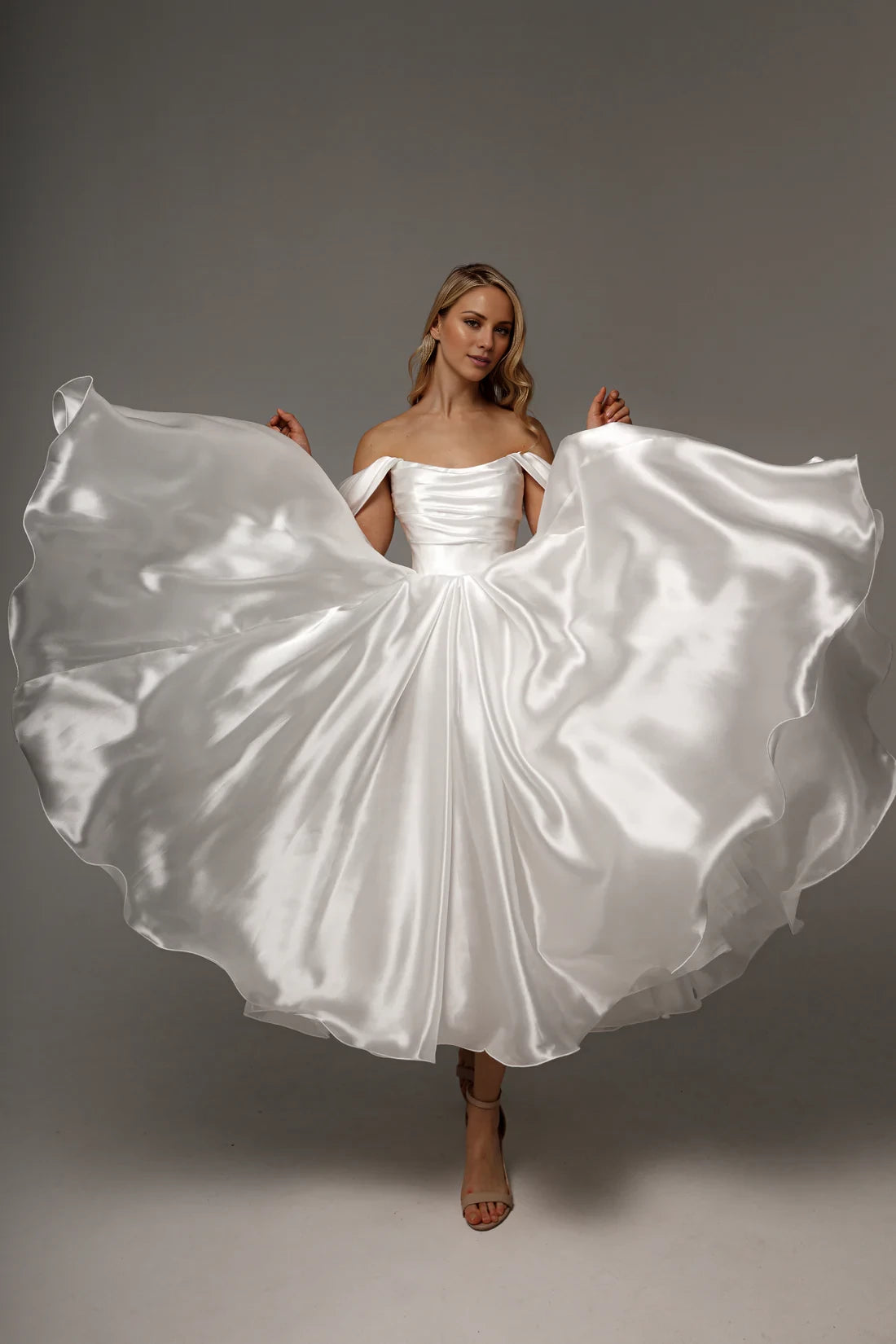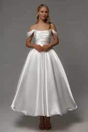 Elegant A-Line Off-Shoulder Sleeveless Satin Lace Up Tea-Length Winter Wedding Dress - US 2 / UK 6 / EU 32
