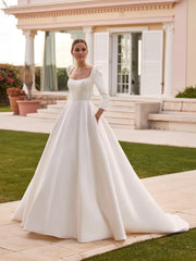 Step into timeless elegance with this ball gown wedding dress. It features a square neckline that exudes sophistication, 3/4 puff sleeves for a romantic and dramatic look, and an open back design that adds a hint of allure. The maxi length, with its flowing silhouette and graceful train, creates a truly regal appearance, perfect for making a memorable entrance on your wedding day. Crafted from luxurious fabric, this dress ensures you look and feel like royalty as you walk down the aisle.