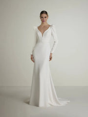 Elegant Mermaid Deep V-Neck Puff Sleeve Open Back Maxi Winter Wedding Dress - US 2 / UK 6 / EU 32