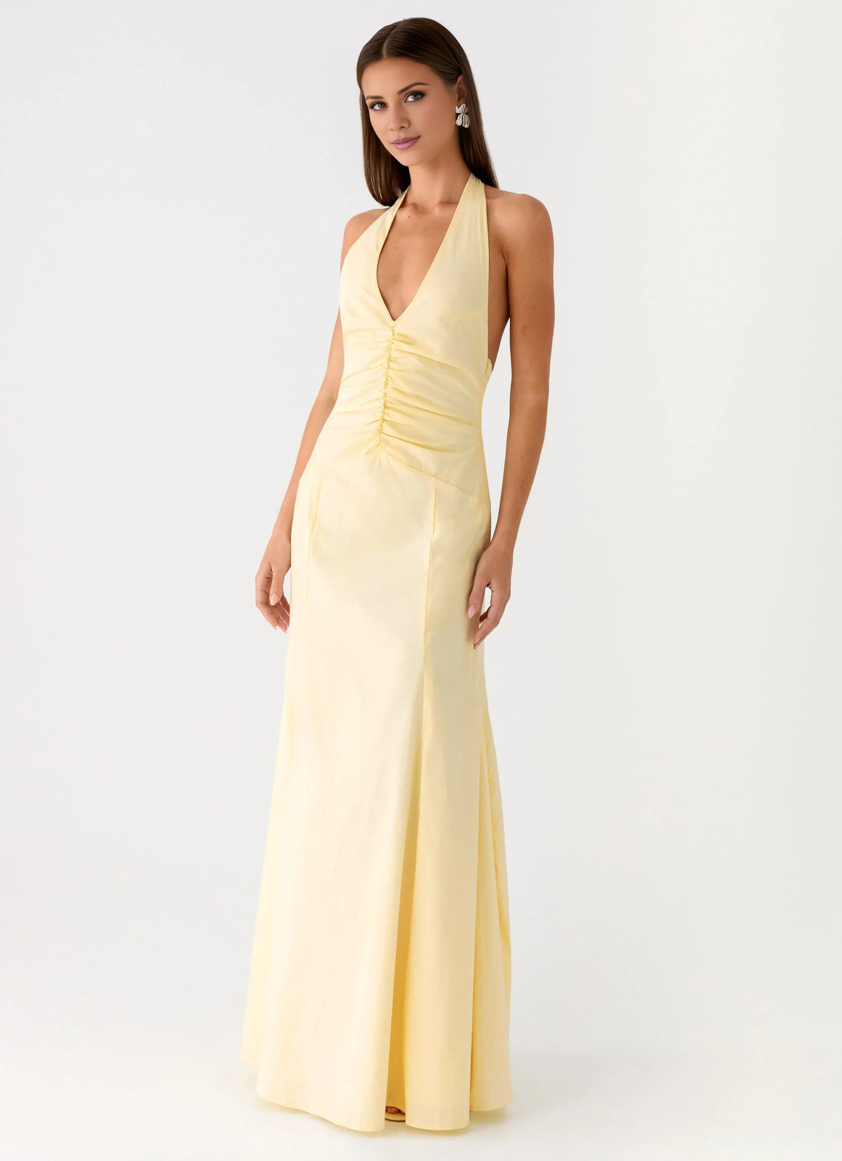 Step into the spotlight with this butter yellow prom dress. It features a halter neck design with ruched detailing that exudes sophistication, an open-back element with tie detailing for a stylish touch, and a flowing maxi length, creating a poised and glamorous look perfect for prom night. Crafted to make you stand out, this dress ensures you feel confident and chic as you celebrate this special occasion.