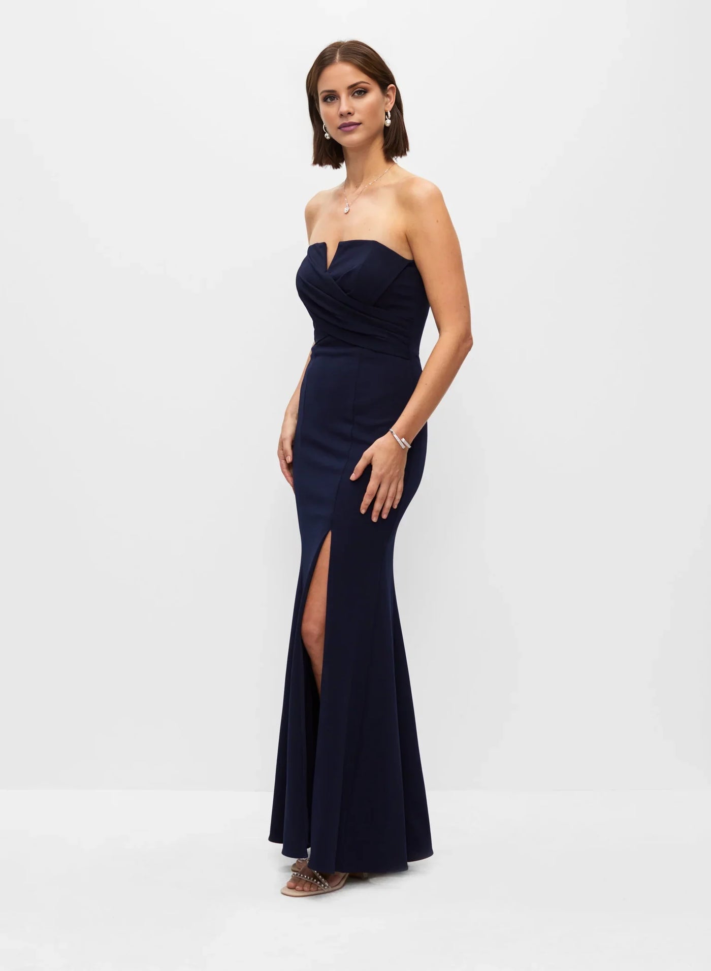 Step into sophisticated glamour with this navy blue evening dress. It features a strapless design with ruched detailing that exudes elegance, a side-slit element for stylish movement, and a mermaid silhouette that flatters beautifully, creating a poised and alluring appearance. Perfect for formal events or special occasions, this dress ensures you look and feel confident and chic.