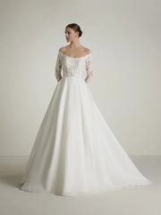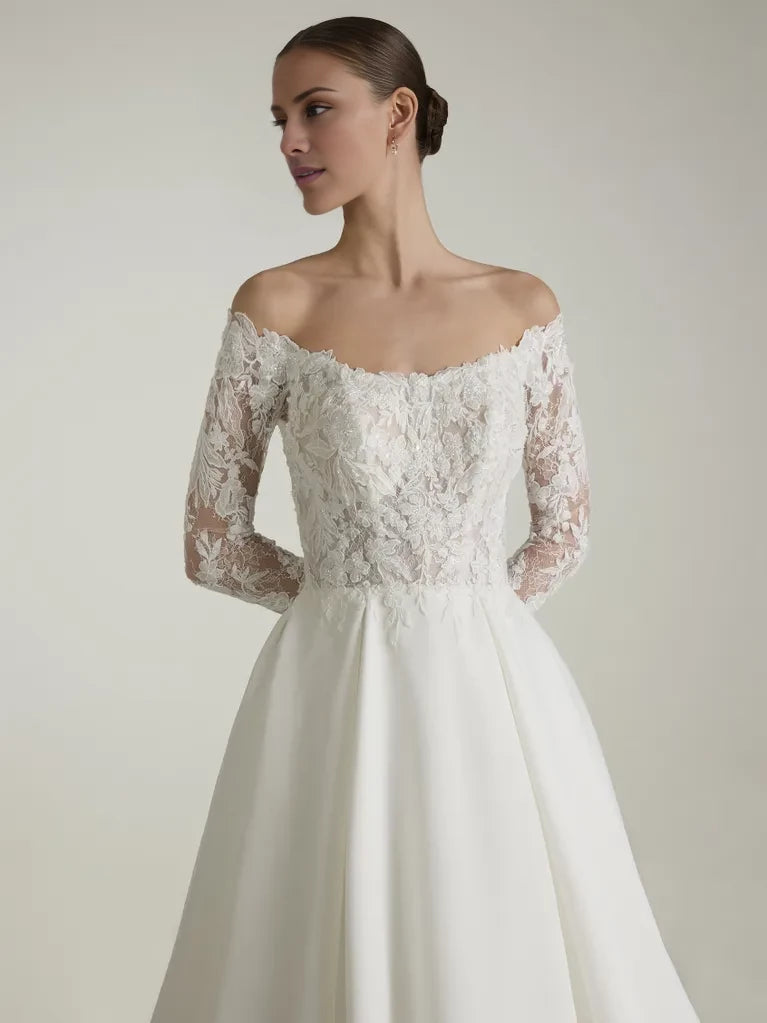 Step into a world of romance with this A - line wedding dress. It features an off - shoulder neckline adorned with delicate lace, long sleeves for an elegant touch. The maxi length, with its flowing silhouette and graceful train, creates a dreamy and ethereal appearance, perfect for a romantic wedding celebration. Crafted from soft, luxurious fabric, this dress ensures you look and feel like royalty as you walk down the aisle.
