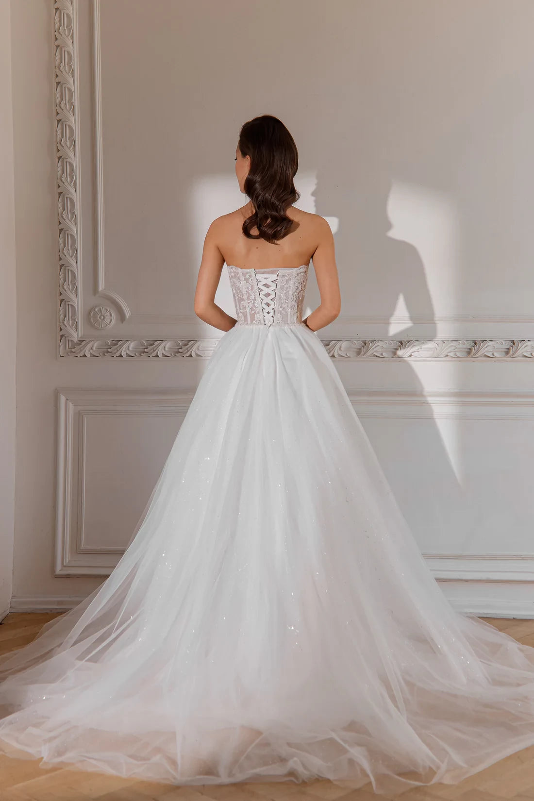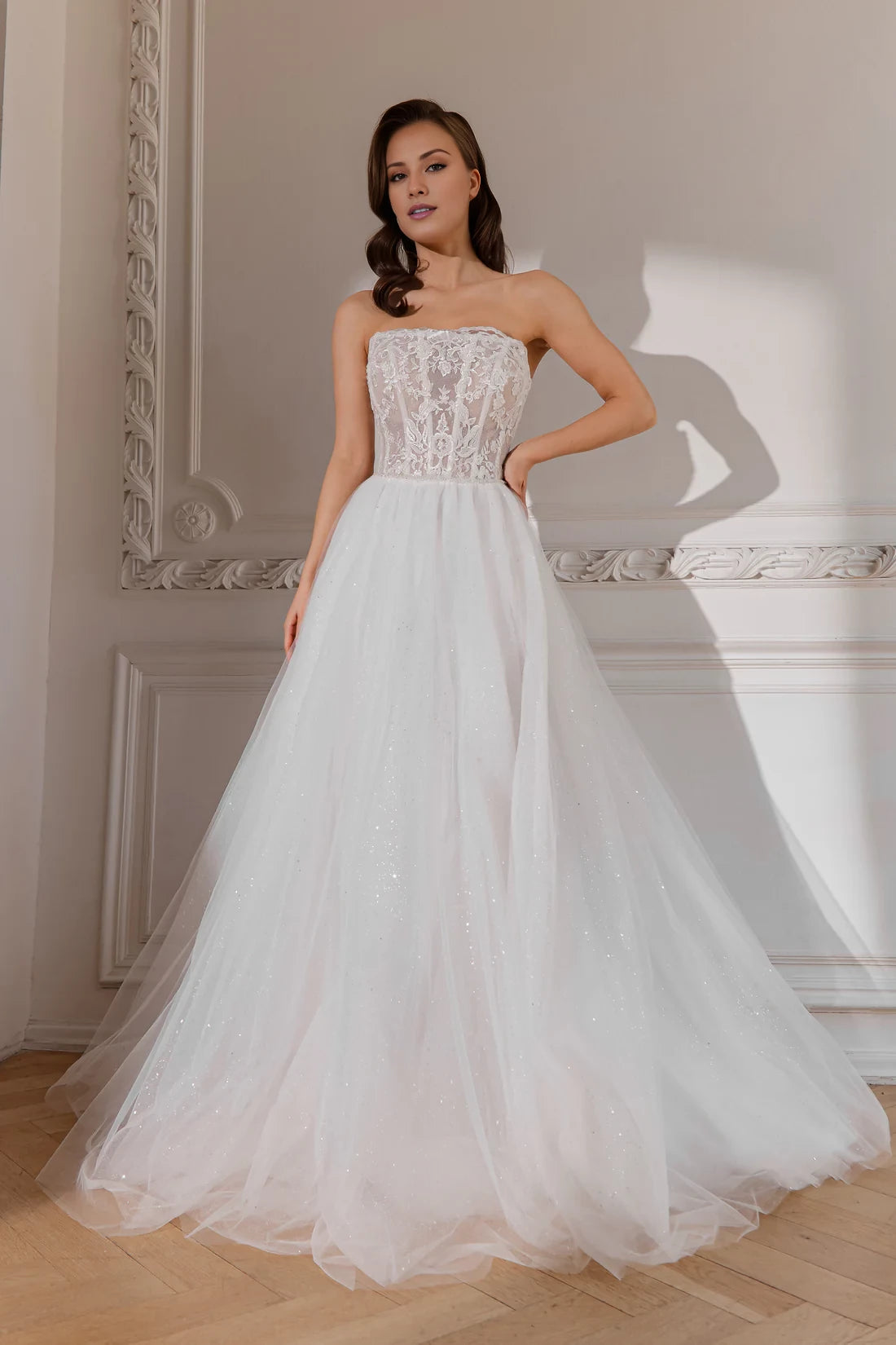 Step into a world of romance with this ball gown wedding dress. It features a strapless neckline that exudes elegance, intricate lace embroidery on the bodice for a touch of artistry, and a sparkling tulle skirt that catches the light beautifully. The maxi length, with its voluminous silhouette and graceful train, creates a truly dreamy appearance, perfect for a romantic wedding celebration. Crafted from luxurious, shimmering material, this dress ensures you look and feel like royalty as you walk down the aisle.