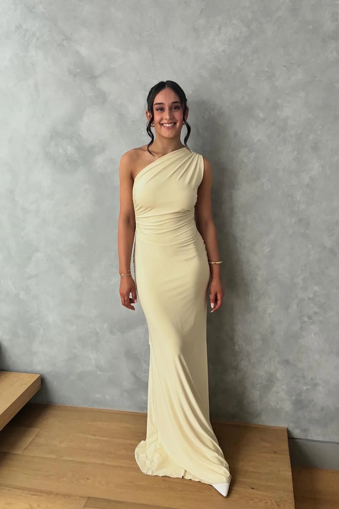 This chic prom dress offers a modern, sophisticated silhouette with a one-shoulder neckline and ruched bodice that cinches your waist for a flattering fit. The stretchy, buttery-soft fabric sculpts your curves into a sleek mermaid shape, flowing into a floor-length hem that moves beautifully with every step. Its showstopping twist-back design—adorned with a long, elegant drape—adds a touch of drama and ensures a perfect, adjustable fit. The warm butter cream hue and minimalist style make it ideal for prom, formal galas, or any special occasion where you want to look effortlessly confident and unforgettable.