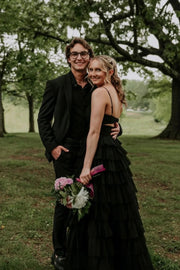 This showstopping prom dress features a romantic V-neckline and a ruched bodice with a subtle cutout detail that adds a modern touch. The multi-layered, textured ruffle skirt cascades into a floor-length hem with a high thigh slit, creating a dramatic silhouette that moves gracefully with every step. Available in classic white and bold black, this gown balances timeless elegance with contemporary flair—perfect for prom night, weddings, or any formal event where you want to feel both glamorous and unforgettable.