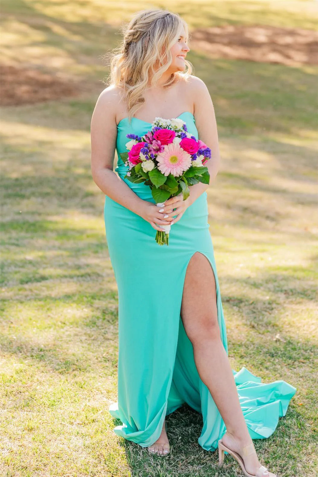 This romantic prom dress features a soft strapless sweetheart neckline, crafted from stretchy, comfortable jersey fabric that hugs your curves beautifully. The figure-hugging mermaid silhouette flows into a floor-length skirt with a high side slit and a delicate train, while a large, adjustable bow tie at the open back adds a feminine, customizable focal point. Its fresh mint hue and elegant design make it perfect for prom, wedding receptions, or any special occasion where you want to look effortlessly romantic and chic.