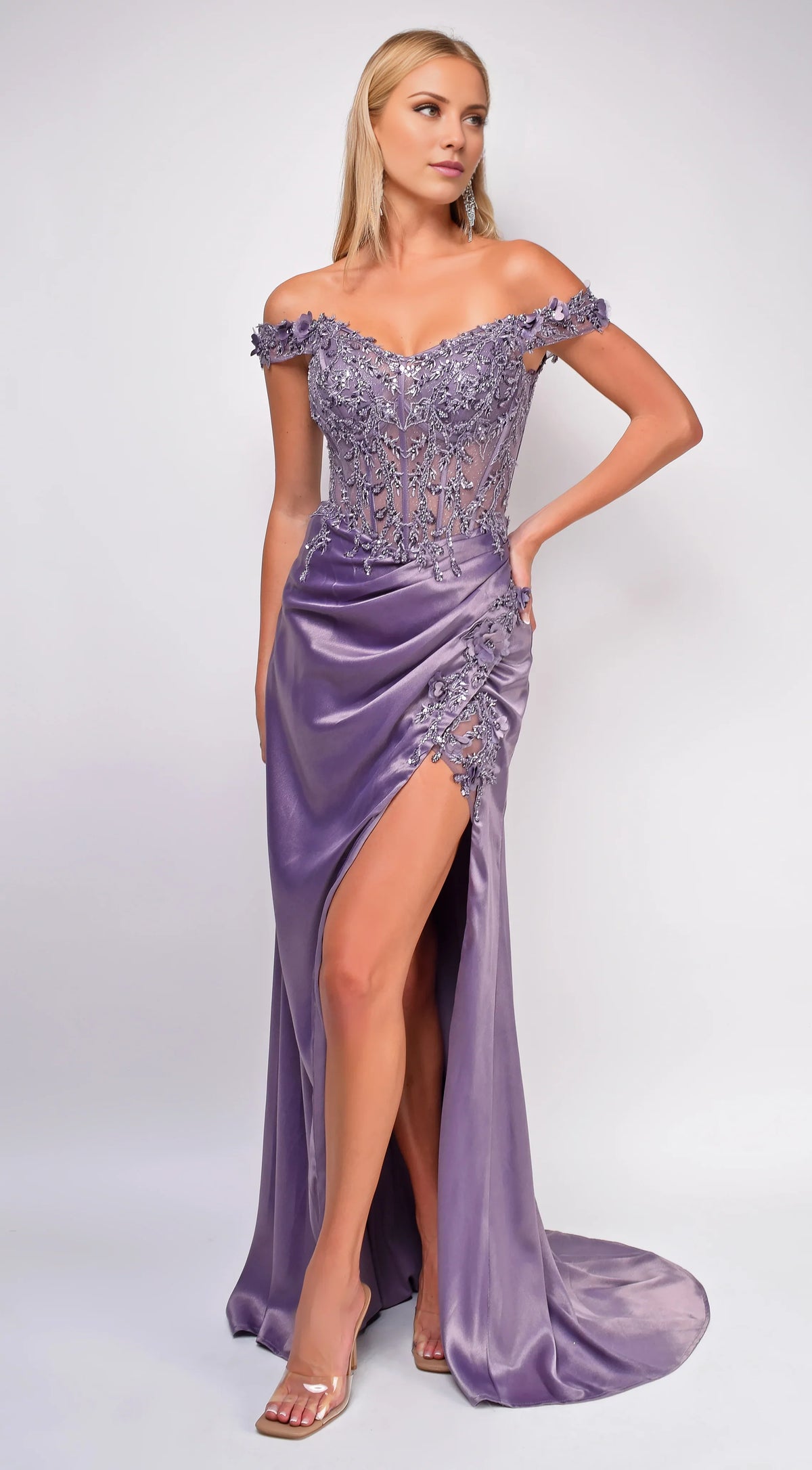 This lavender satin dress features a sleek mermaid silhouette, off-shoulder neckline, and intricate embroidered lace detailing. The dramatic high slit and flowing train add allure, while the smooth fabric creates a luxurious, polished look—ideal for evening events, galas, or upscale gatherings, balancing sophistication with glamorous detail.