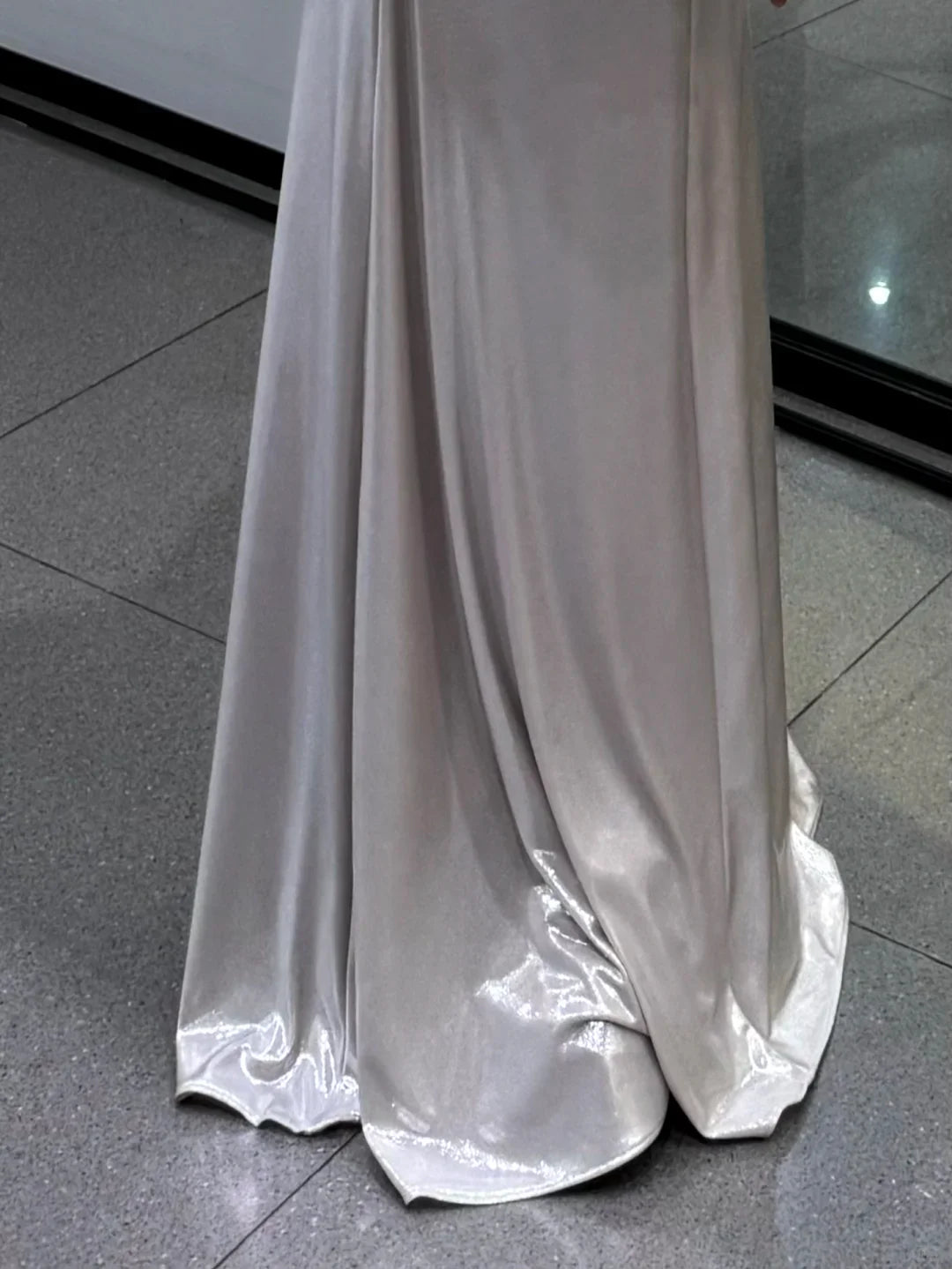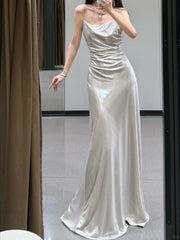 Satin Spaghetti-Strap Cowl Neck Ruched Bodice Open-Back Floor-Length Train Glamorous Formal Evening Dress - US 2 / UK 6 / EU 32