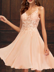 Abiti da cocktail a trapezio, eleganti, corti/mini, senza maniche, scollo a V, rosa, in tulle con applicazioni.