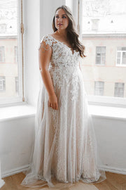 Romantic A-Line V-Neck Short Sleeve Lace Embroidered Illusion Back Plus Size Maxi Winter Wedding Dress