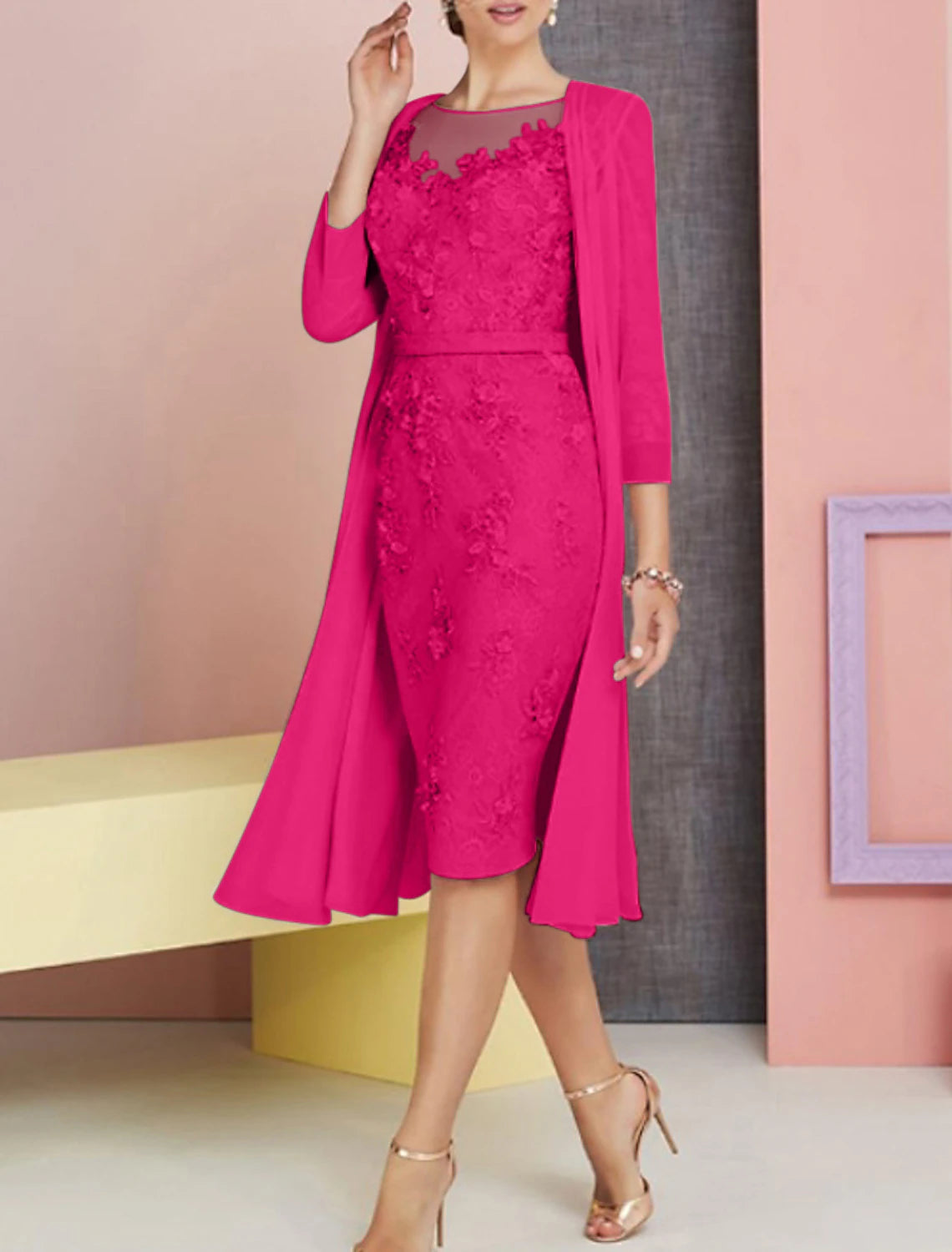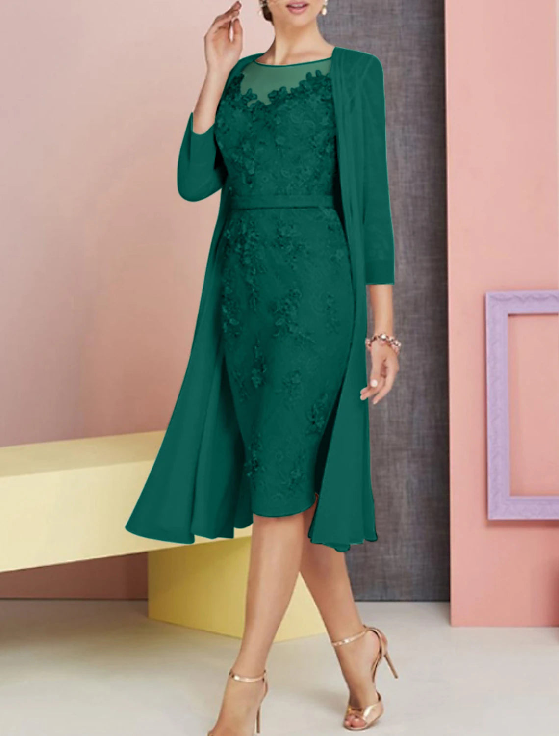 Two Piece Sheath / Column Mother of the Bride Dress Wedding Guest Church Elegant Vintage Plus Size Bateau Neck Knee Length Chiffon Lace 3/4 Length Sleeve Jacket Dresses with Appliques - Pearl Pink / US 2 / UK 6 / EU 32