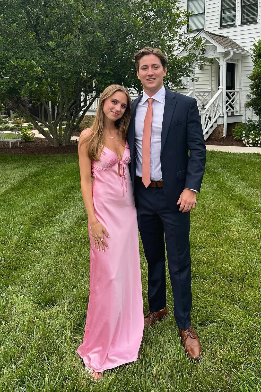 V-Neck Satin Maxi Prom Dress with Front Tie Cutout, Open Back Bow & Adjustable Spaghetti Straps - Pink / US 2 / UK 6 / EU 32
